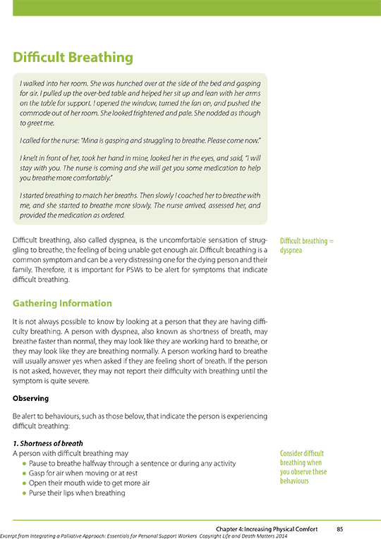 We’re offering an excerpt from the textbook, Integrating a Palliative Approach: Essentials for Personal Support Workers, titled “Common Symptoms – Difficult Breathing” to assist you when supporting a person with a COVID-19 infection. This section describes key signs indicating a person is experiencing breathlessness and discusses comfort measures for supporting a person experiencing difficult breathing. We hope that it helps you as you support people ill with COVID-19.